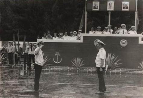 Слева направо: полковник М. А. Титенок – командир 922-го ПМТО, вице-адмирал А. А. Кузьмин – командир эскадры, капитан 1 ранга Ву Лапп – командующий 4-м ВМР ВМС СРВ. Từ trái sang phải: Đại tá MA Titenok - Tư lệnh 922 PMTO, Phó đô đốc A. Kuzmin - chỉ huy trưởng của đội, Đại úy Ngô Lập - chỉ huy trưởng Hải quân vùng 4 BMP Việt Nam.